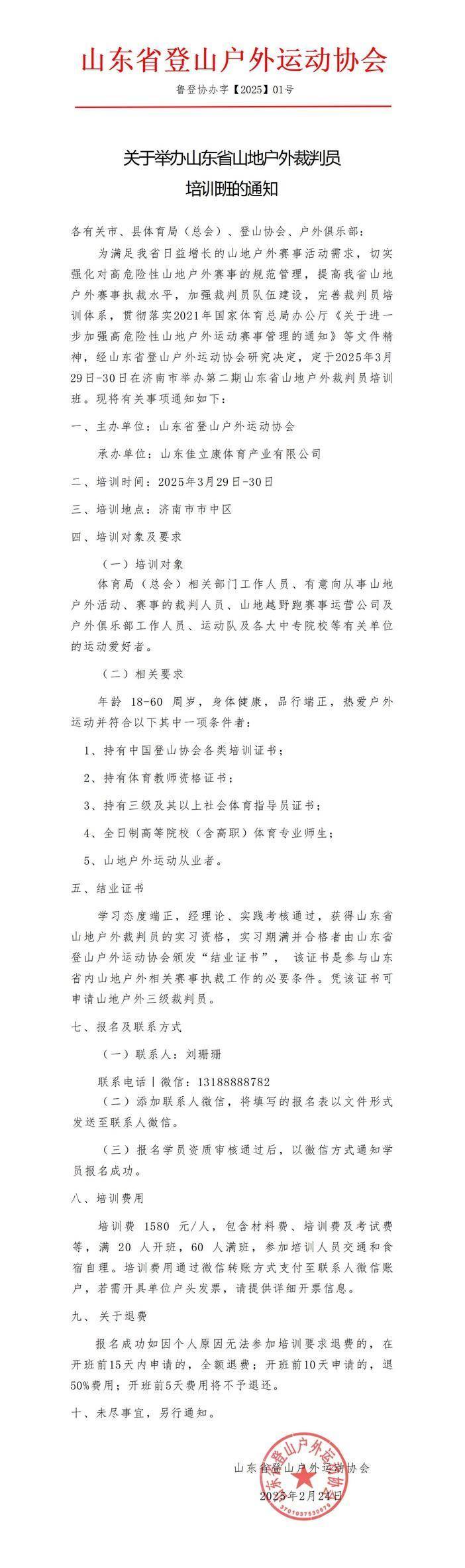关于举办2025年山东省第二期户外裁判员培训班的通知