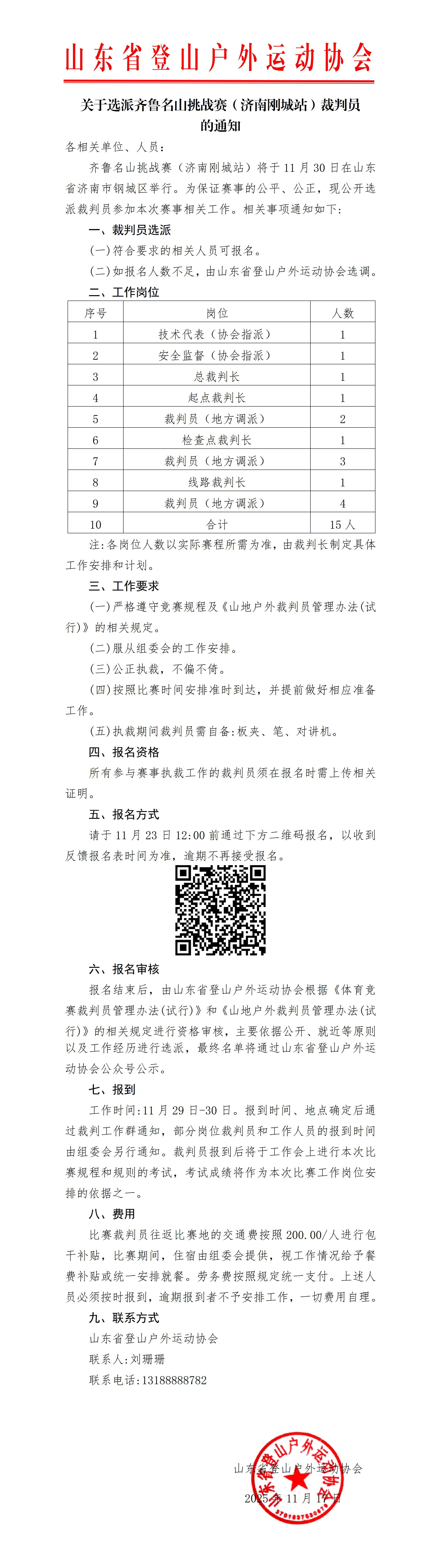 关于选派齐鲁名山挑战赛(济南刚城站)裁判员的通知